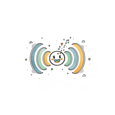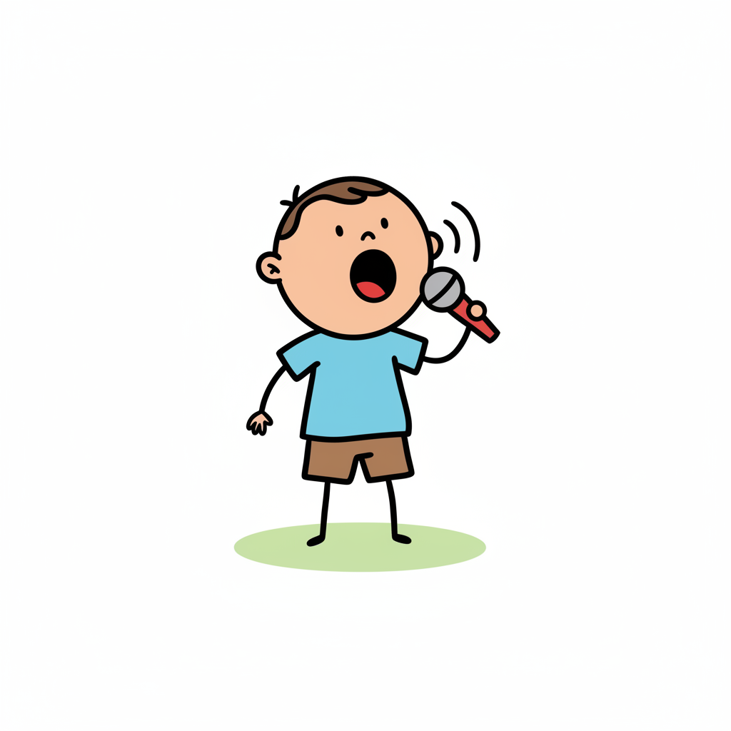 Ein Cartoon-Junge singt mit offenem Mund in ein Mikrofon, umgeben von Schallwellen.