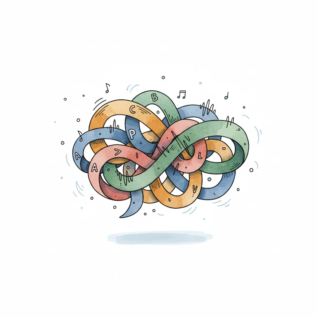 Buntes, verworrenes Band mit Buchstaben, Noten und Schallwellen, symbolisiert Kommunikation/Kreativität.