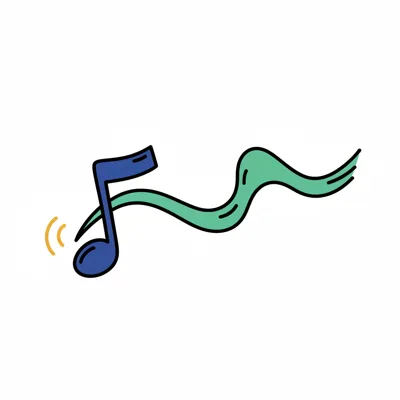 Handgezeichnete blaue Musiknote mit Schallwellen und grüner Wellenlinie auf weißem Grund.