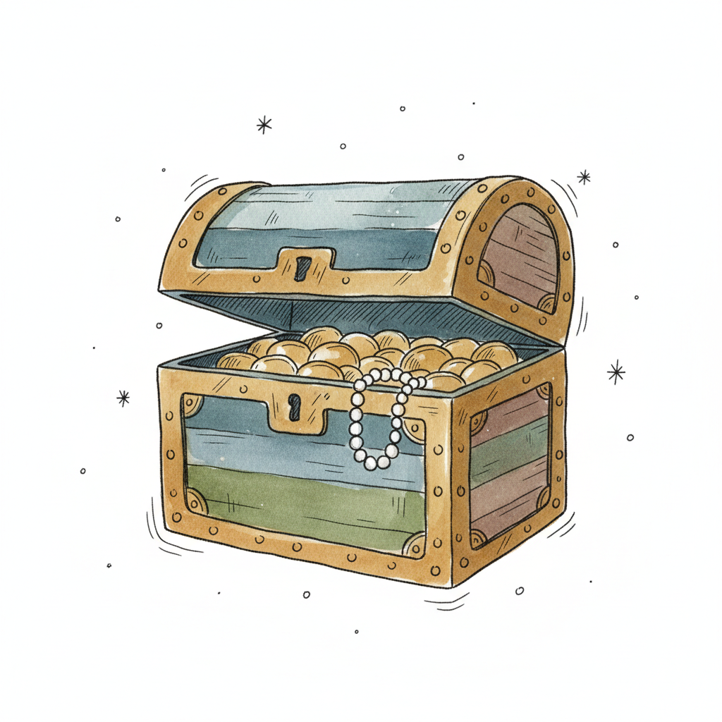 Illustrierte, offene Schatzkiste gefüllt mit Goldmünzen und einer Perlenkette.