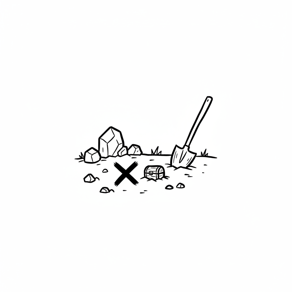Handgezeichnetes Bild einer Schaufel, Schatzkiste und einem X auf dem Boden, umgeben von Steinen.
