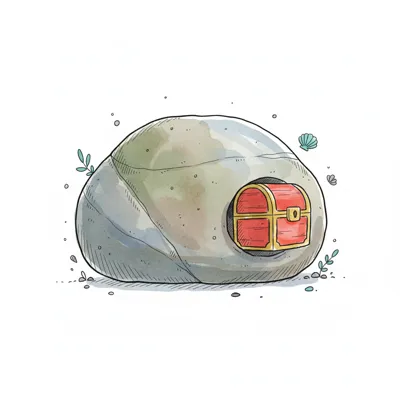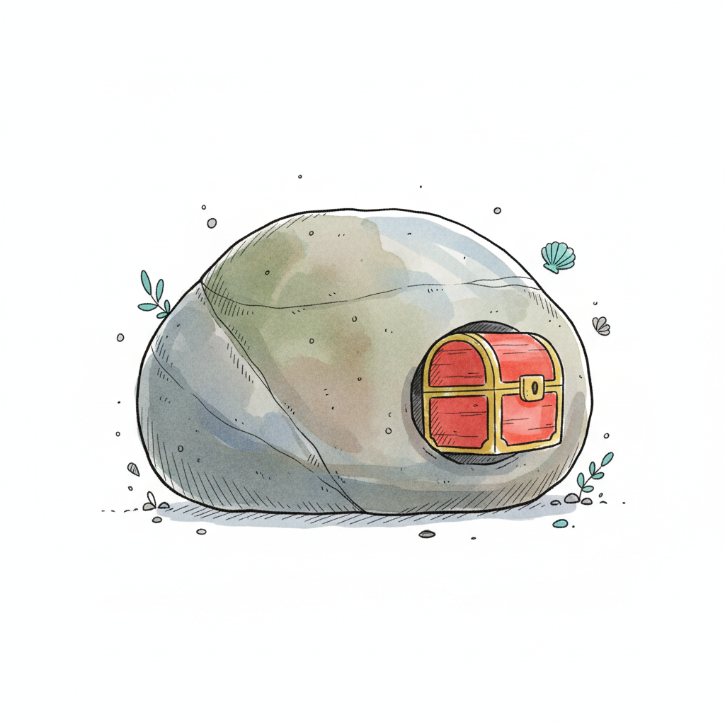 Aquarell-Illustration: Ein Fels mit einem roten Schatzkästchen, umgeben von Pflanzen und Muschel.