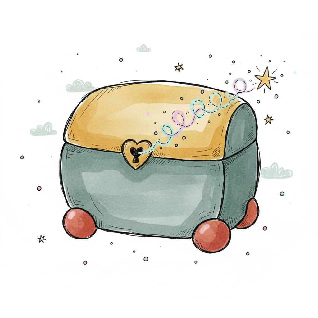 Eine magische Truhe mit Herzschloss, aus der ein bunter Faden zu einem leuchtenden Stern führt.