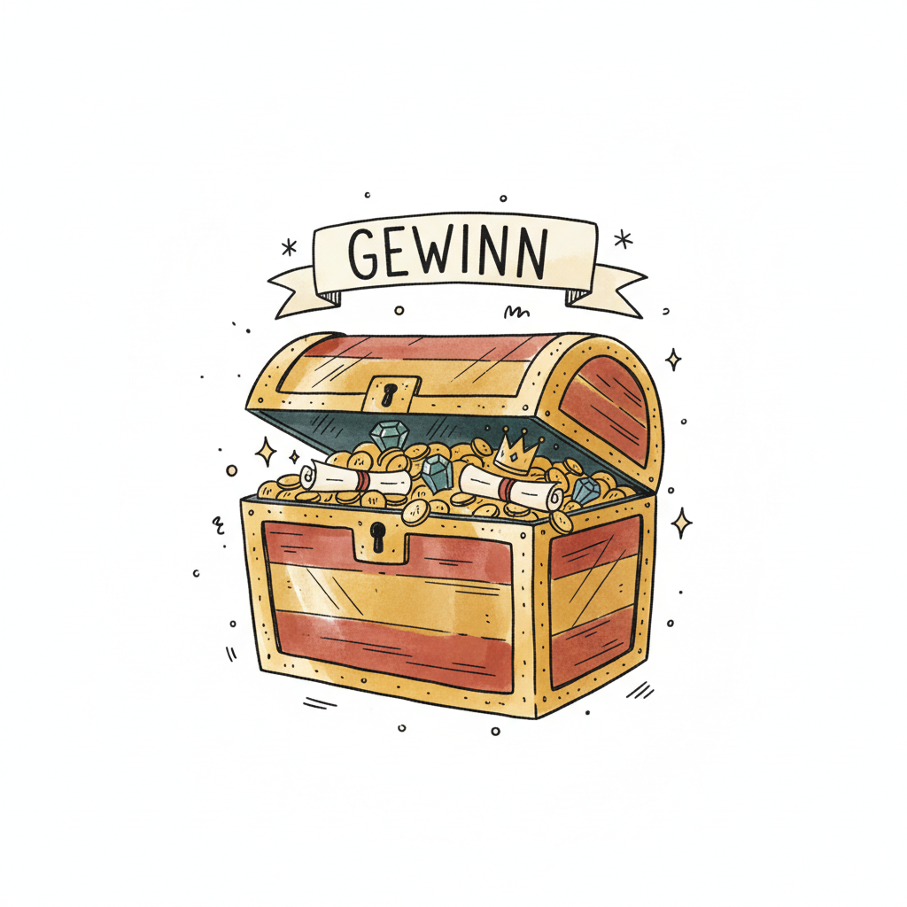 Bunte Illustration einer offenen Schatzkiste mit Gold, Edelsteinen und Schriftrollen, 'GEWINN'.