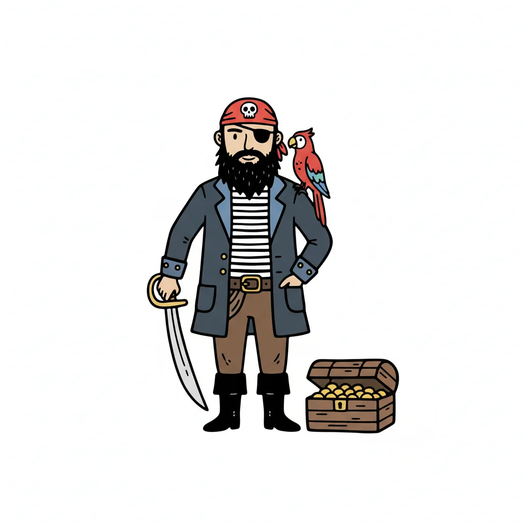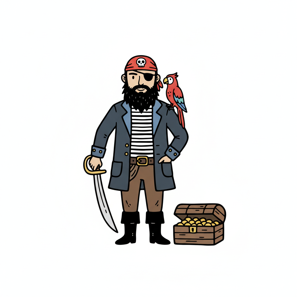 Cartoon-Pirat mit Papagei auf der Schulter, Säbel und einer geöffneten Schatzkiste voller Gold.