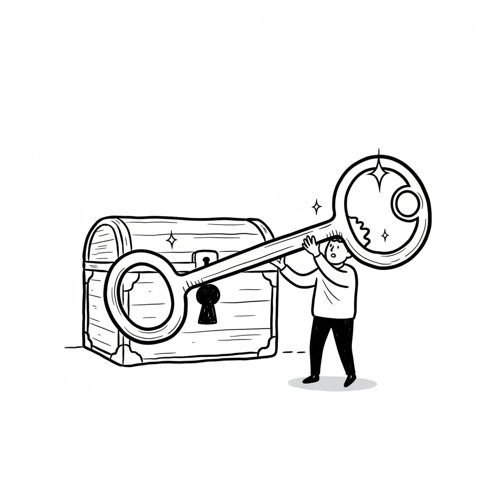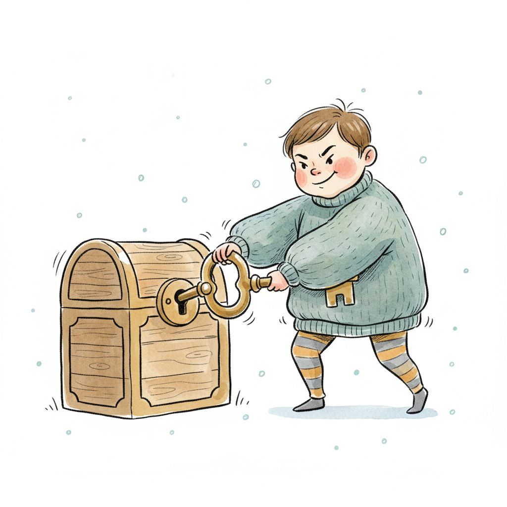 Ein Cartoon-Junge versucht, eine Holztruhe mit einem großen goldenen Schlüssel zu öffnen.
