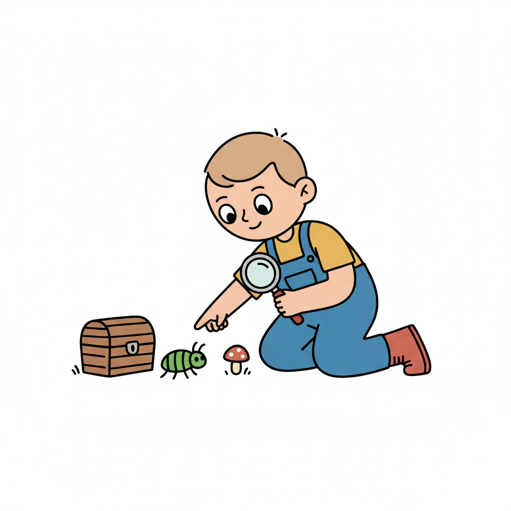 Ein Junge kniet, untersucht mit einer Lupe ein Insekt neben einem Pilz und einer Schatzkiste.