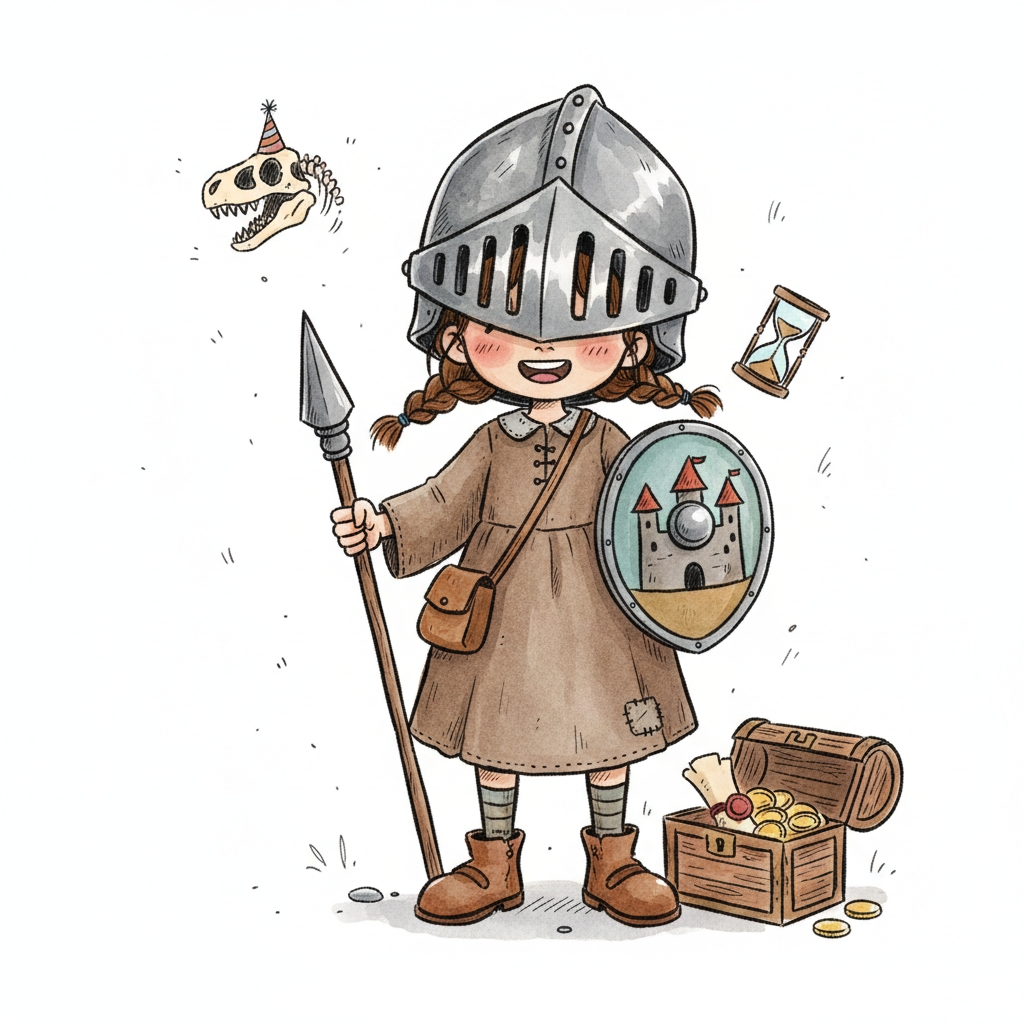 Cartoon-Mädchen als Ritterin mit Speer, Schild, Schatzkiste, Dino-Schädel und Sanduhr.