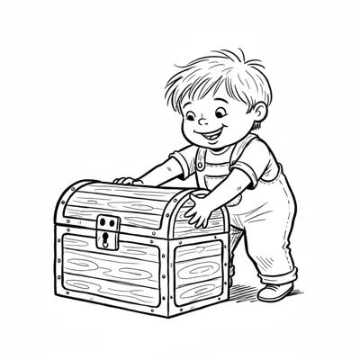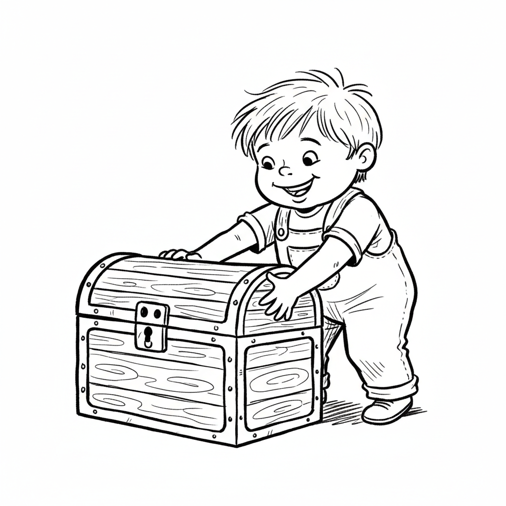 Ein lächelnder Junge in Latzhose steht vor einer Schatzkiste. Schwarz-Weiß-Zeichnung.