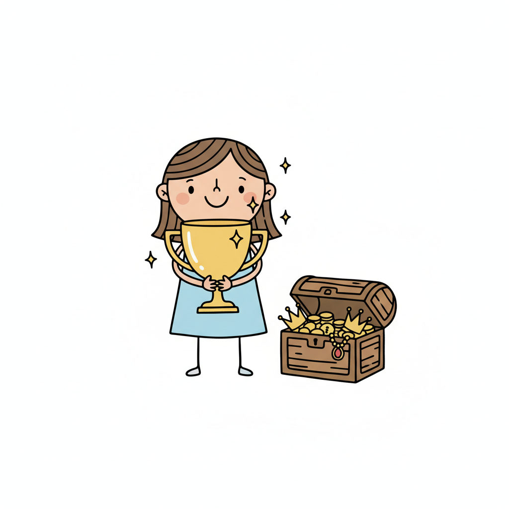 Glückliches Cartoon-Mädchen mit Pokal und Schatzkiste voller Gold und Kronen.