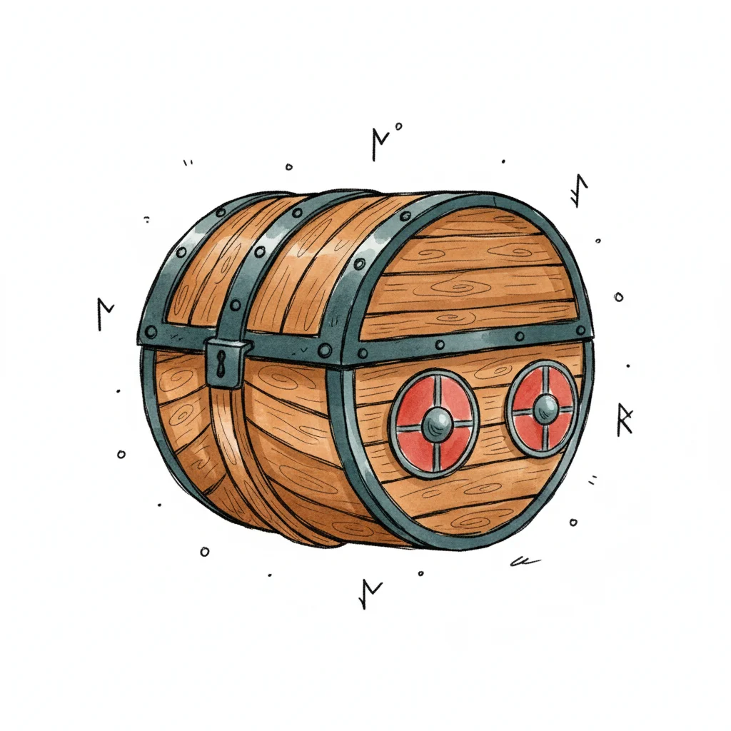 Fassförmige Holztruhe mit Metallbändern, Schloss und roten Wikinger-Schild-Details, umgeben von Runen.
