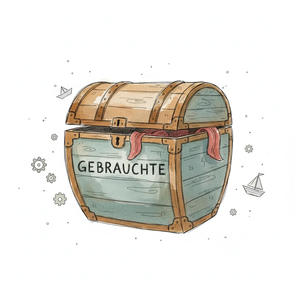 Aquarellzeichnung einer geöffneten Schatzkiste mit 'GEBRAUCHTE' und Stoff, umgeben von Booten und Zahnrädern.