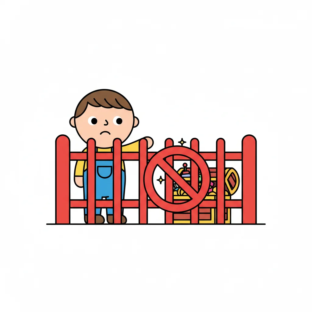 Trauriger Junge hinter Zaun, vor einer verbotenen Schatzkiste mit Verbotsschild.