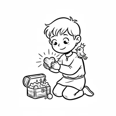 Junge kniet mit leuchtendem Herz, Schatzkiste und Vogel mit Krone auf der Schulter.