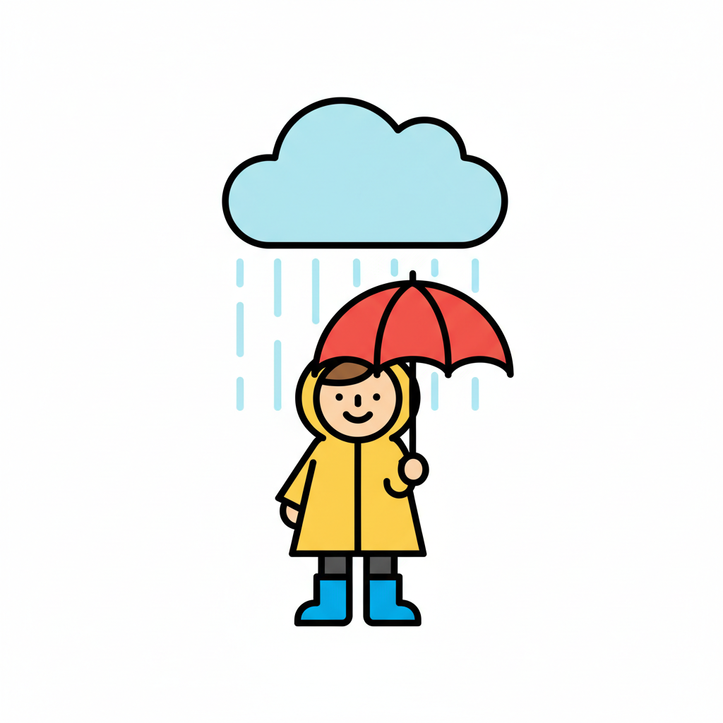 Ein Kind mit Regenschirm steht im Regen unter einer Wolke.