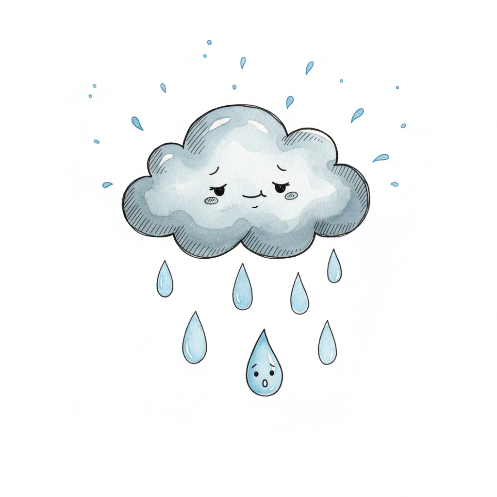 Traurige Wolke mit Regentropfen, die nach unten fallen.