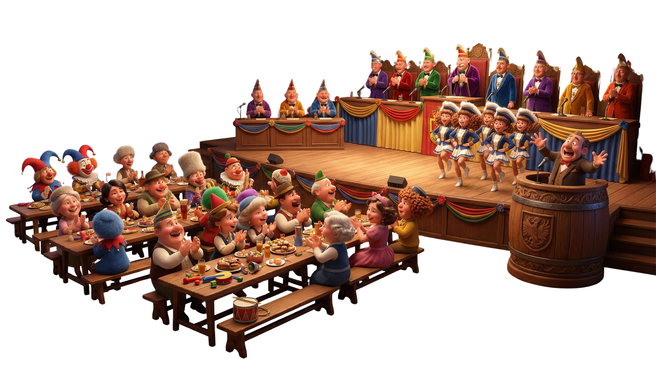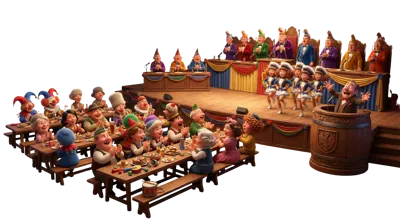 Bunte Festversammlung mit tanzenden Figuren und fröhlichen Zuschauern.
