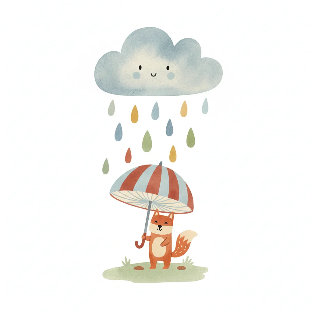 Ein niedlicher Fuchs hält einen Regenschirm unter einem lachenden Wolken.