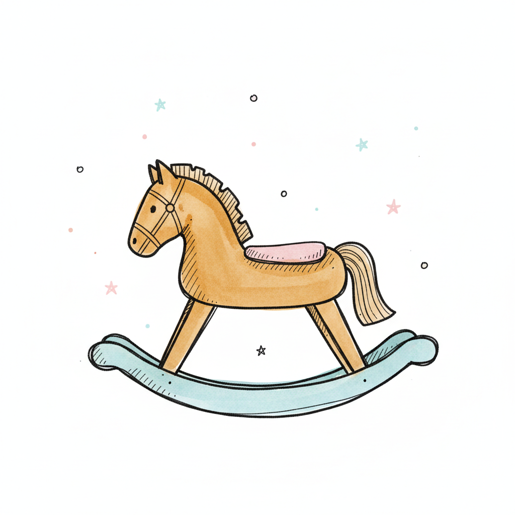 Ein Holzschaukelpferd auf einem hellen Hintergrund mit bunten Sternen.