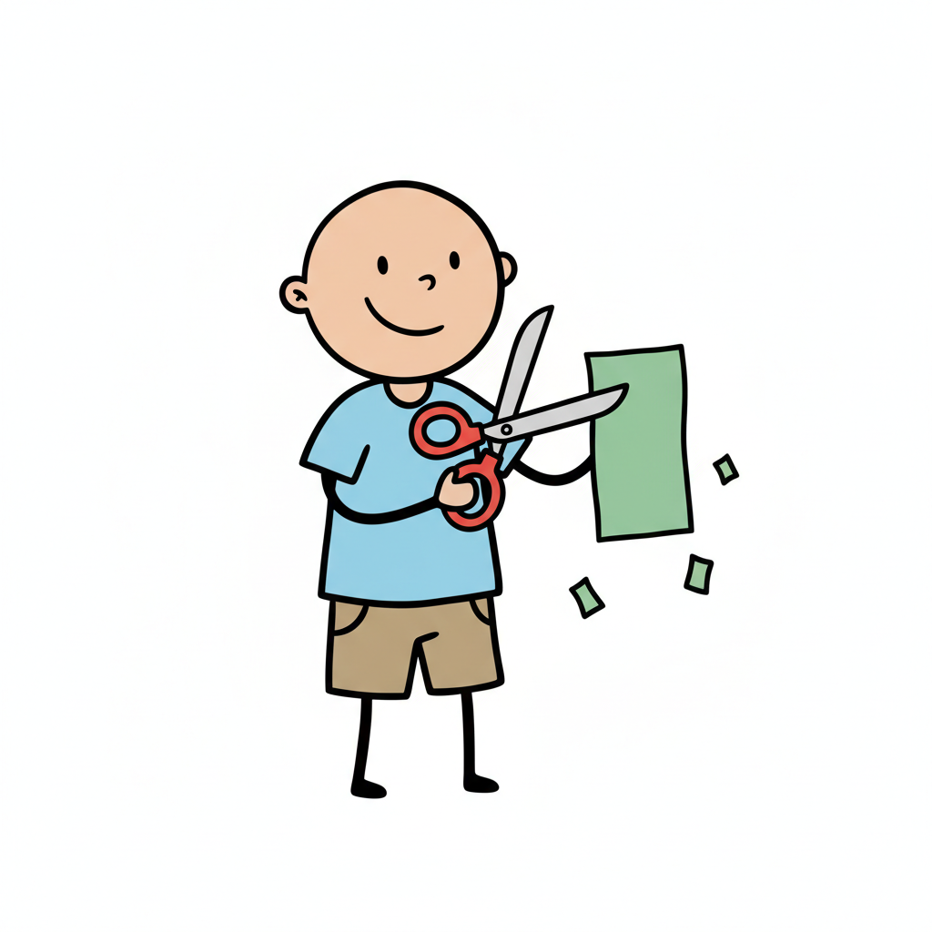 Ein Kind schneidet Papier mit einer Schere und lächelt dabei.