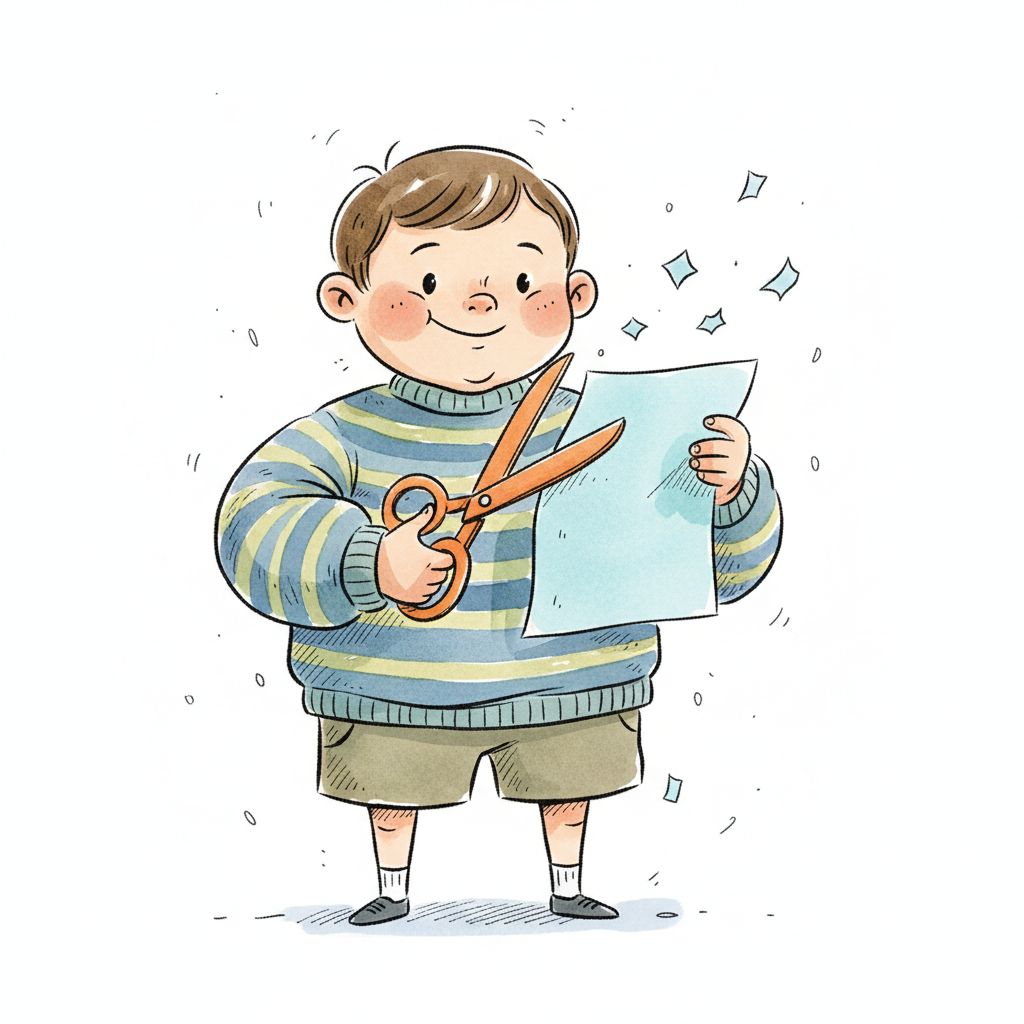 Niedliche, kindgerecht illustrierte Szene mit einem Kind oder einer Person als Hauptfigur, vor rein weißem Hintergrund, im frech-nordischen Aquarell-Skizzenstil. Klare, leicht wackelige Tuschekonturen, sichtbare Pinsel- und Strichtextur, dezente Schraffuren, weiche handgemalte Farbflächen in gedeckten Farben. Einfache, runde Formen. Keine harten Schatten, sondern sanfte, transparente Aquarellschichten. Leicht raue, handgezeichnete Linien statt glatter Vektorkanten. Subtile, vereinzelte Kritzelpunkte oder kleine Details im Hintergrund (wie Pünktchen oder feine Striche), aber keine echte Umgebung oder Landschaft. Die Figur ist mittig zentriert. Insgesamt charmant, humorvoll, warm und handgemacht wirkend. WICHTIG: Das Bild darf ABSOLUT KEINEN TEXT, KEINE BUCHSTABEN und KEINE ZAHLEN enthalten.