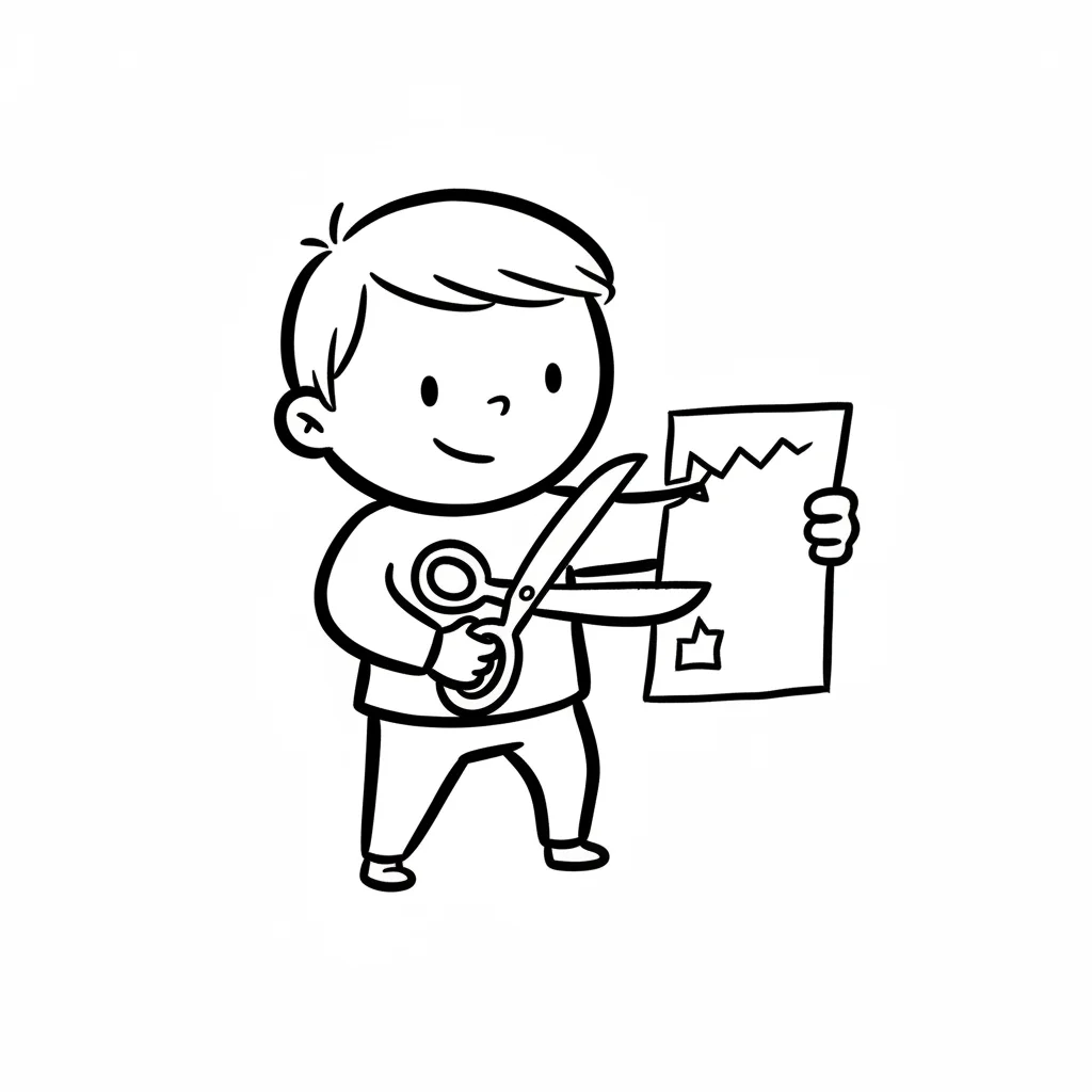 Ein Junge schneidet mit einer Schere ein Blatt Papier.