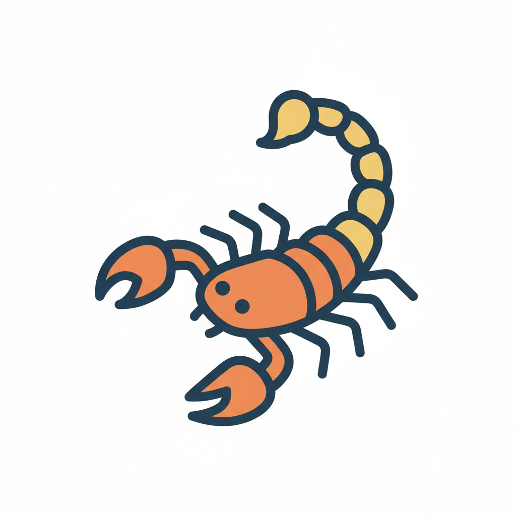 Ein stilisierter Skorpion mit orangefarbenem Körper und großen Scheren.