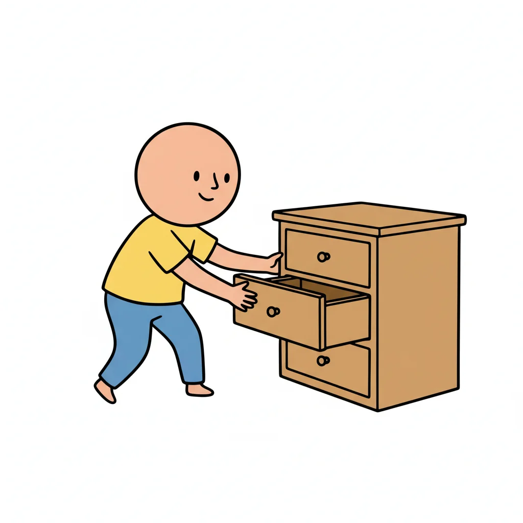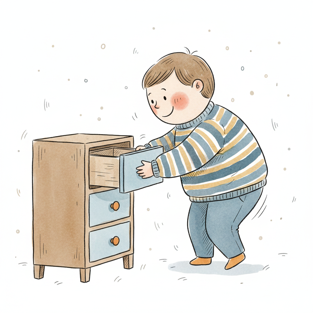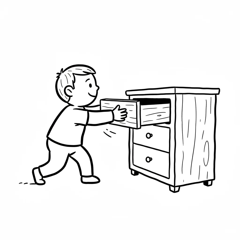Ein Junge zieht eine Schublade aus einem Möbelstück heraus.