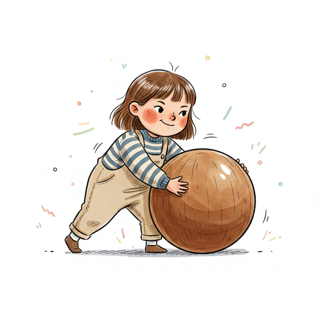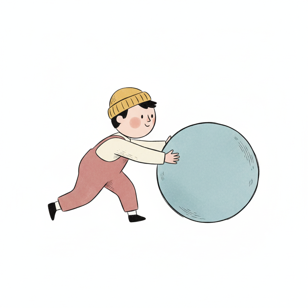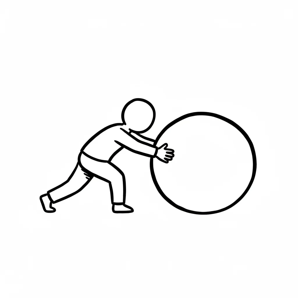 Eine stickfigurenähnliche Figur drückt eine große runde Kugel.