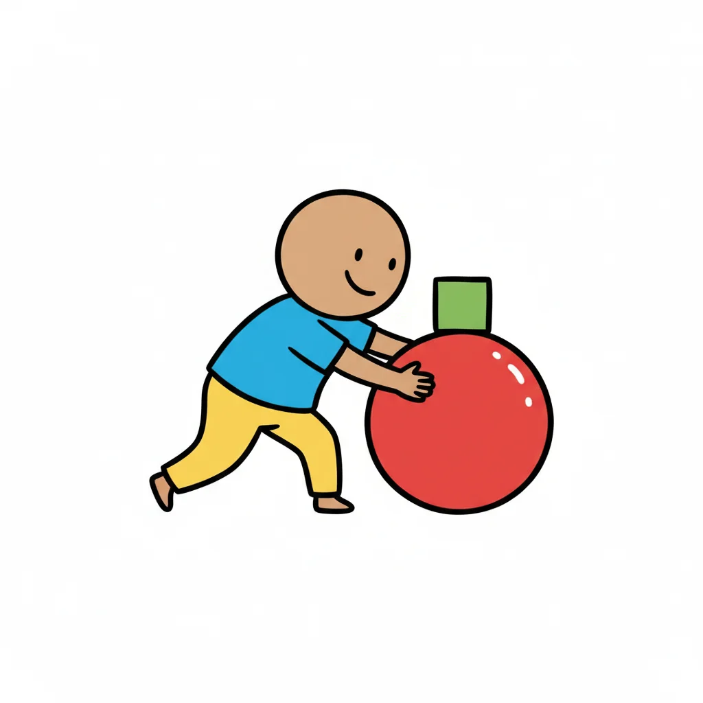 Ein Kind schiebt eine große rote Kugel mit einem kleinen grünen Block.