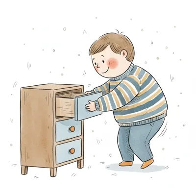 Ein Junge zieht eine Schublade eines Holzschranks heraus.