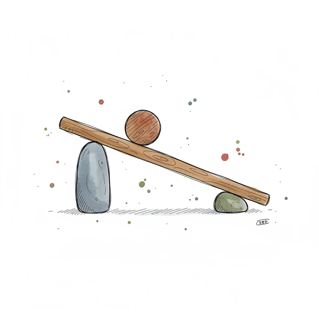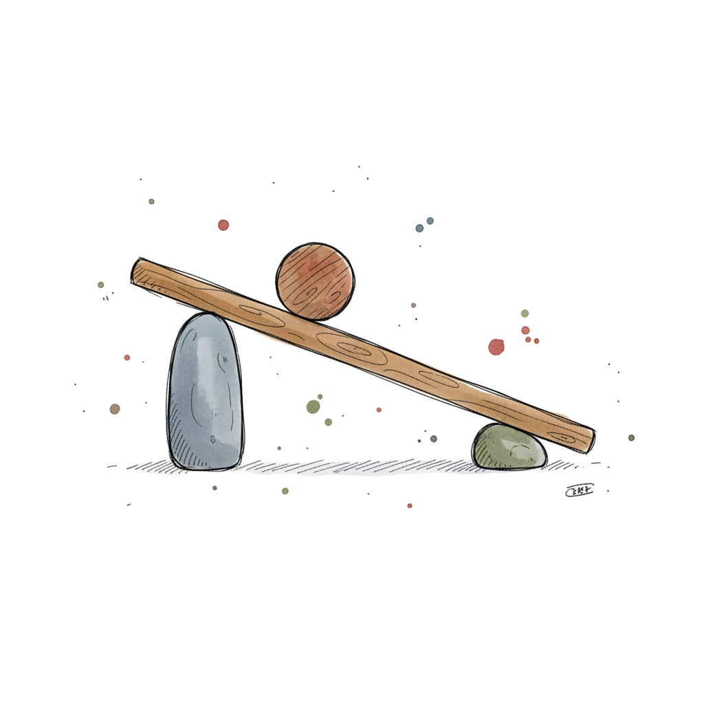 Illustration einer Holzwage mit Kugel und Würfel, die ein Ungleichgewicht zeigt.