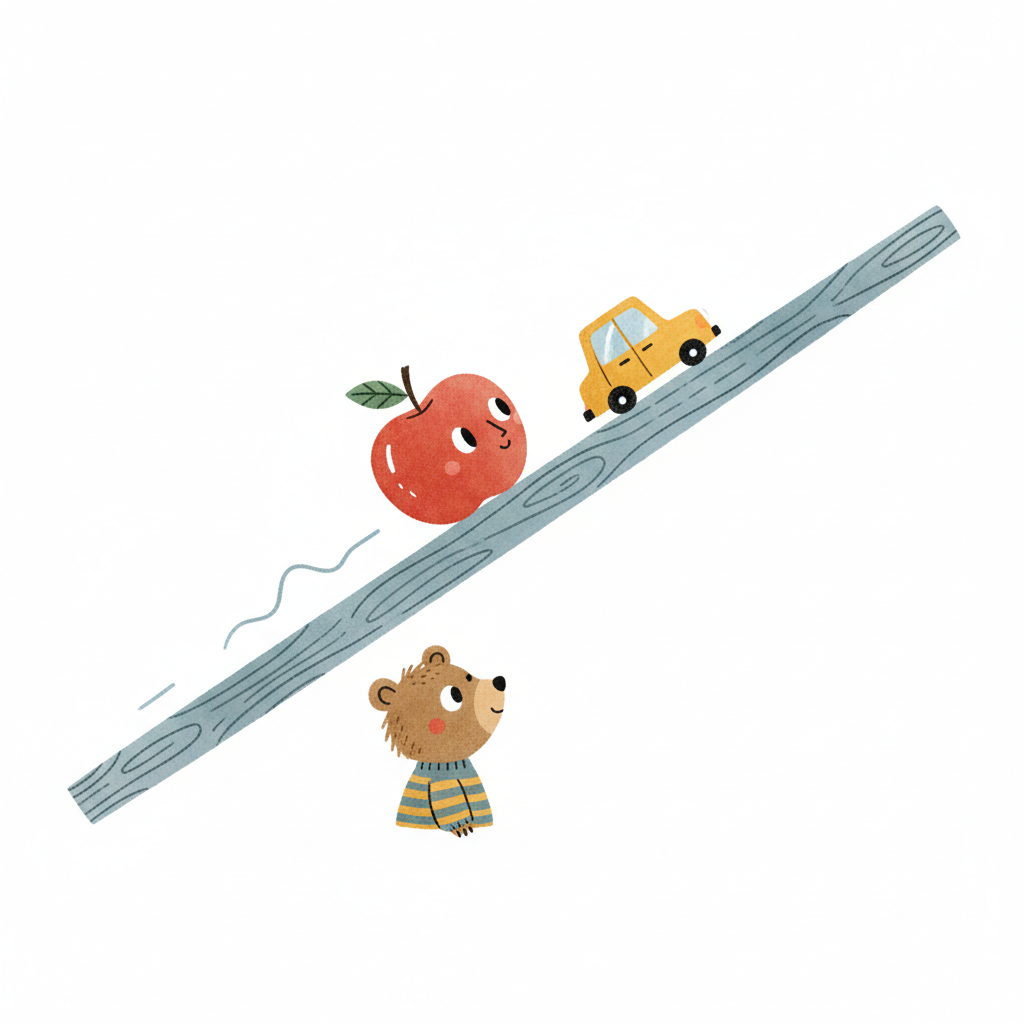 Niedlicher Bär beobachtet einen rollenden Apfel und ein Auto auf einer schiefen Holzplanke.