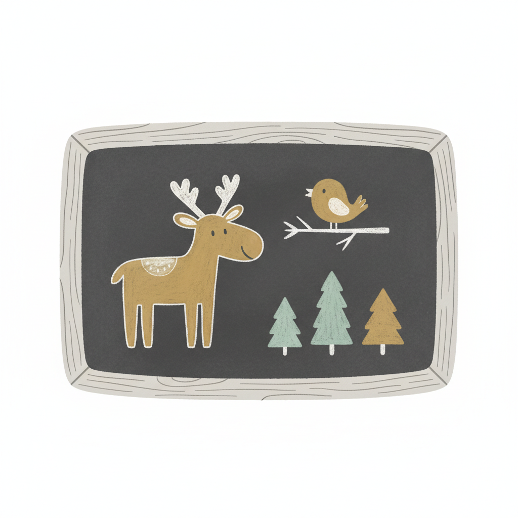 Winterliche Tafel-Illustration mit Elch, Vogel auf Ast und stilisierten Bäumen in sanften Farben.