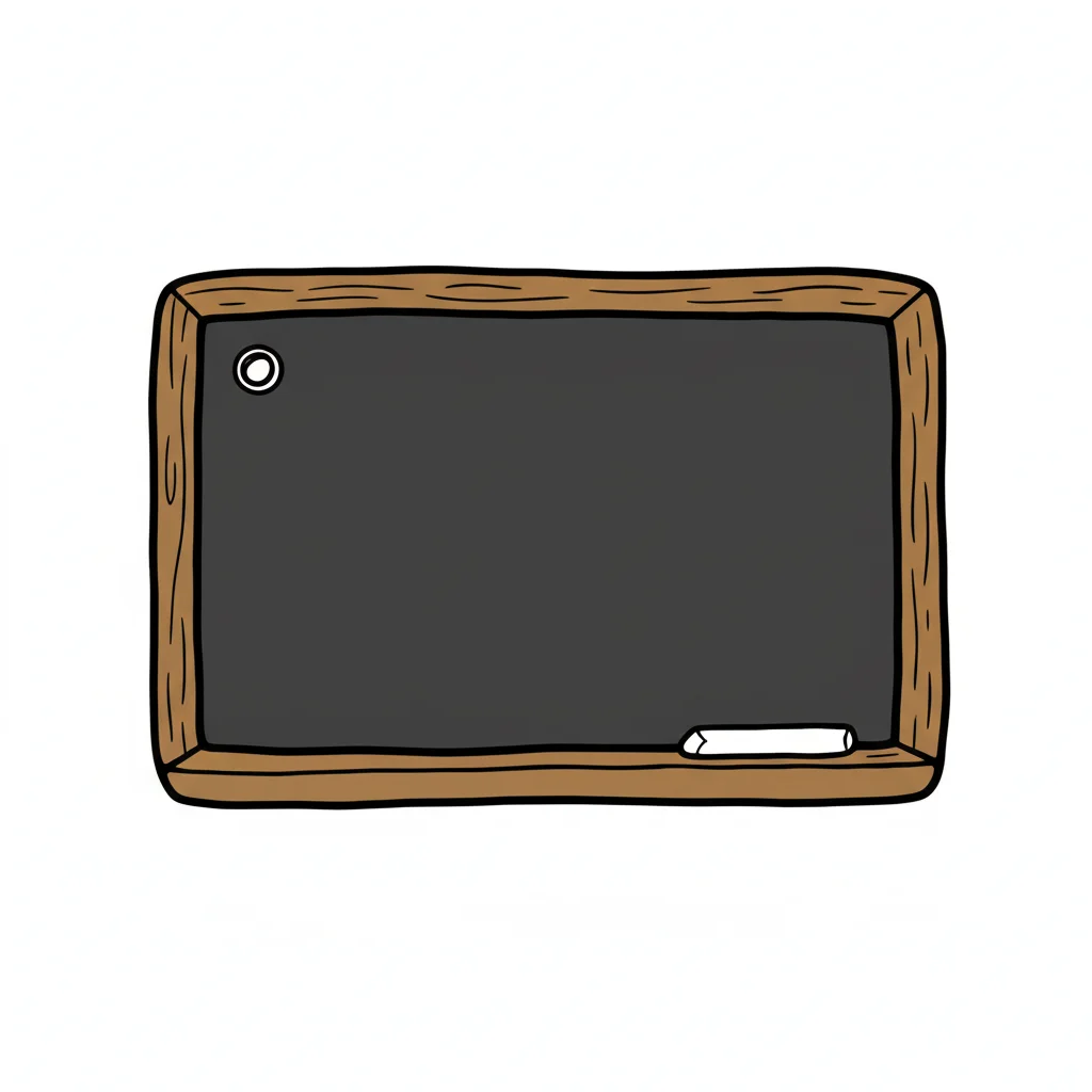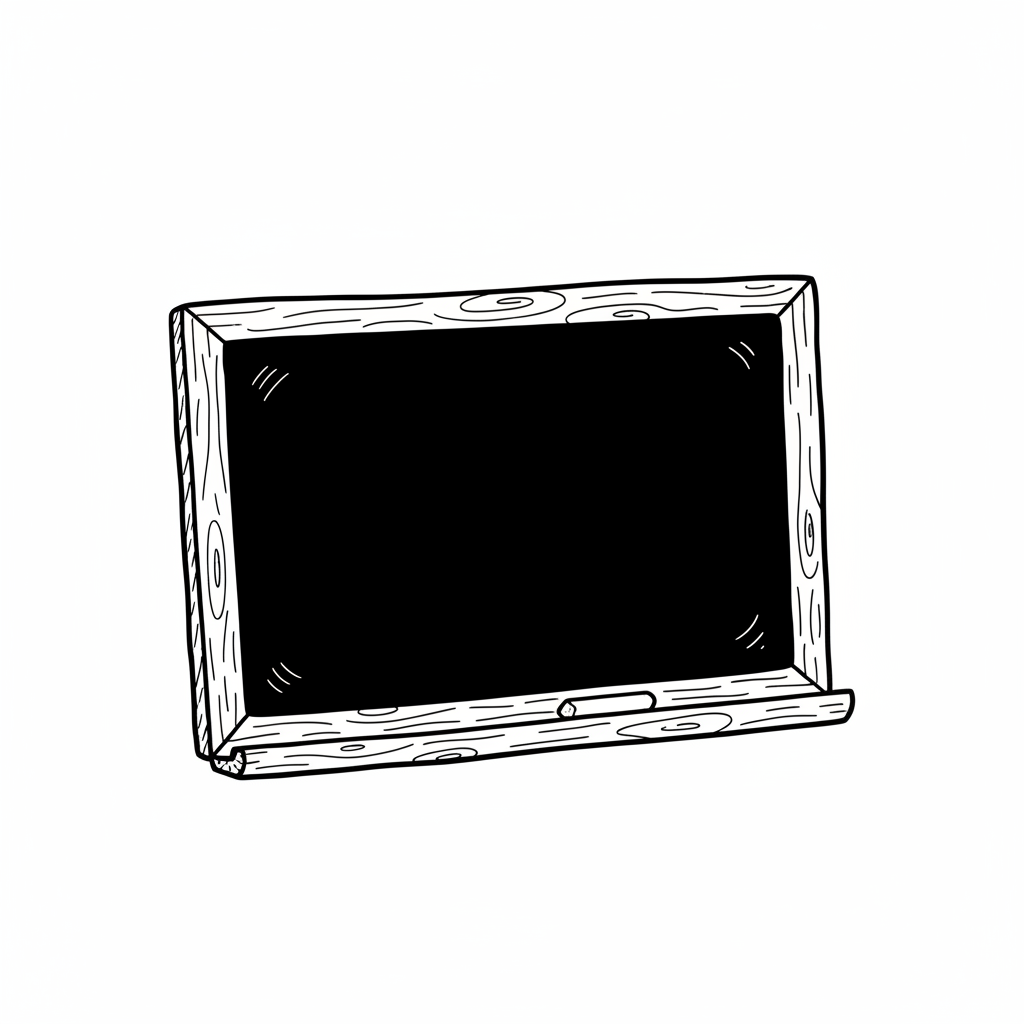 Schwarz-weiß-Zeichnung einer leeren Tafel mit Holzrahmen und Kreide auf der Ablage.