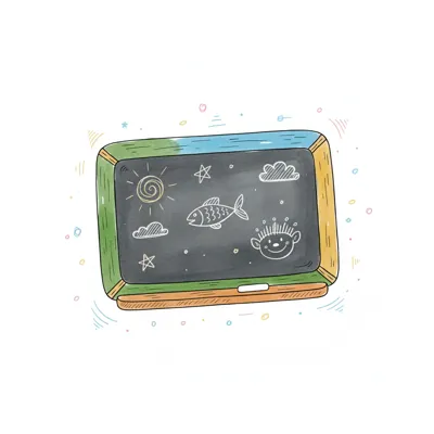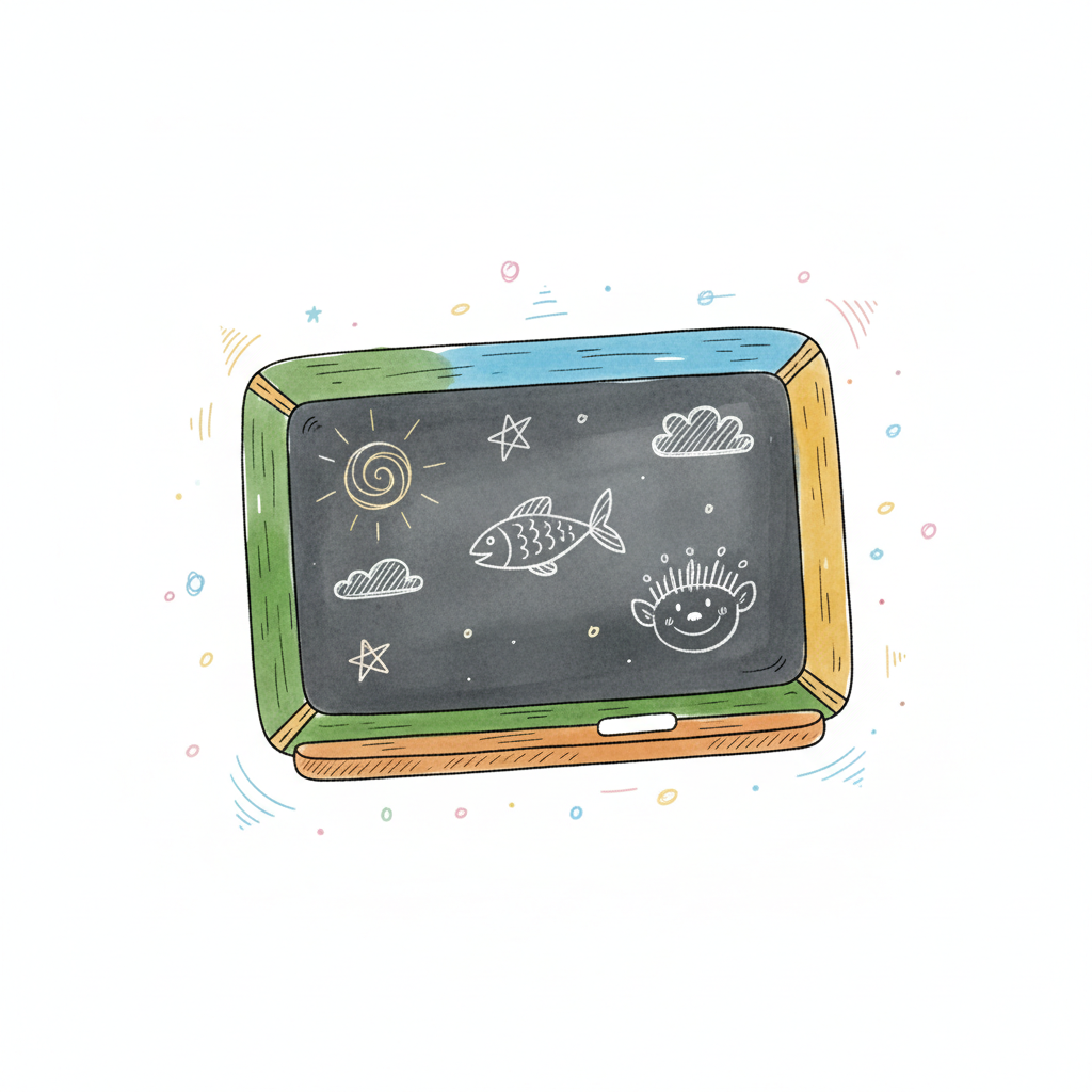Bunte Tafel mit Kreidezeichnungen: Sonne, Wolken, Fisch und lächelndes Gesicht in kindlichem Stil.