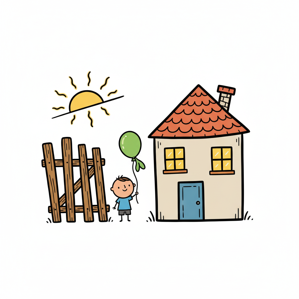 Niedliche Zeichnung: Junge mit Ballon, Haus, Zaun und Sonne.