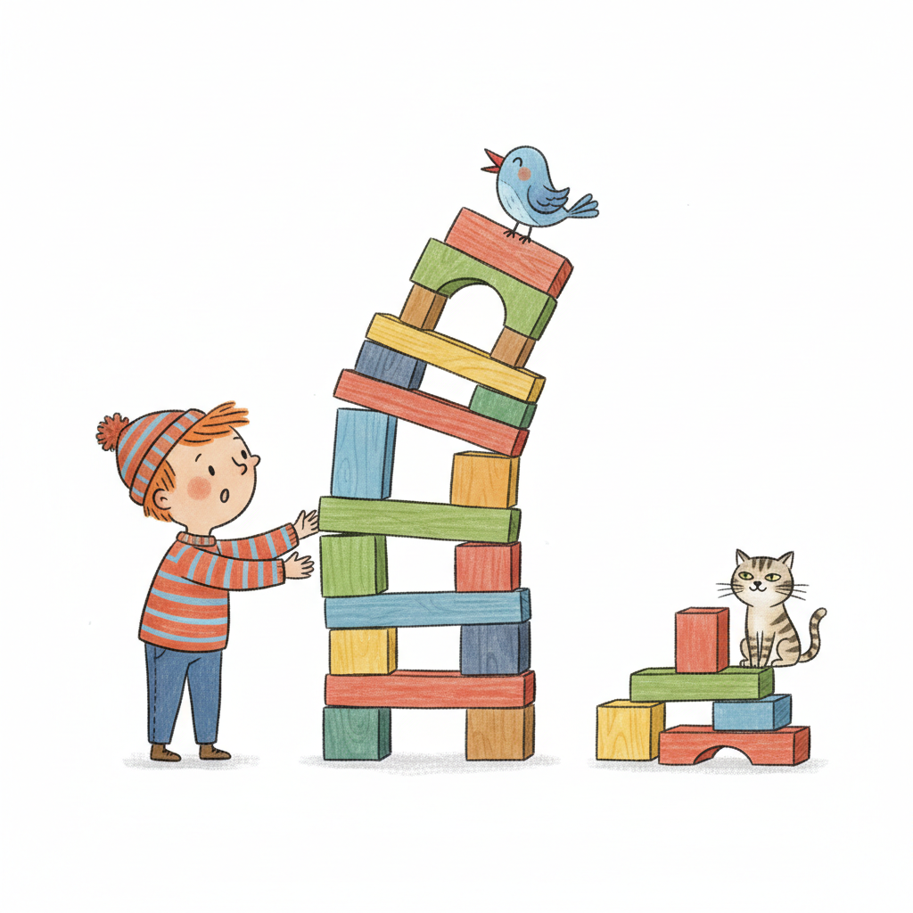 Junge baut wackeligen Klotzturm mit Vogel oben, Katze sitzt auf kleinerem Turm.
