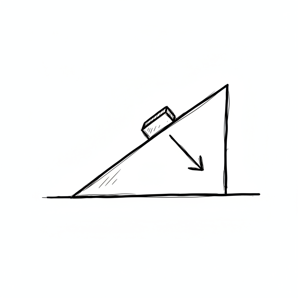 Handgezeichnete Skizze: Ein Klotz auf einer schiefen Ebene, der nach unten gleitet.