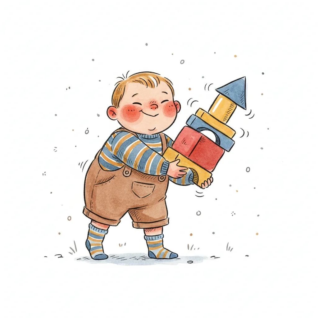 Glückliches Kleinkind mit roten Wangen hält einen Raketenturm aus bunten Holzklötzen.