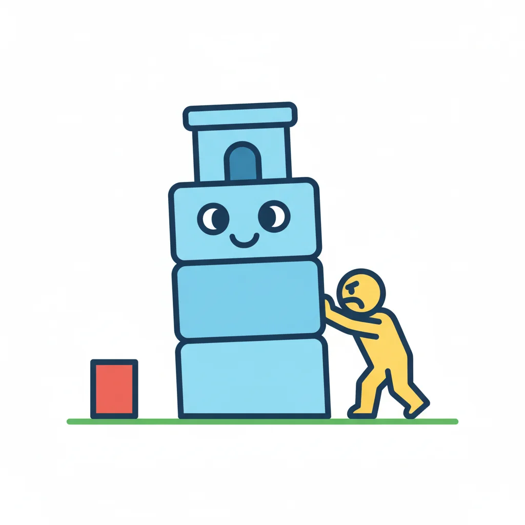 Gelbe Figur schiebt wütend einen hohen Turm aus blauen Blöcken, der fröhlich aussieht.
