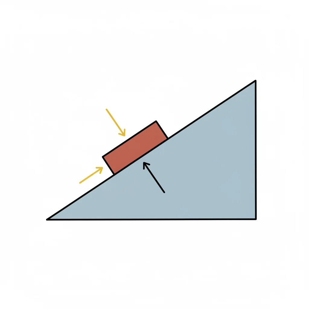 Ein roter Block liegt auf einer schiefen Ebene, mit Kräften senkrecht zur Oberfläche dargestellt.