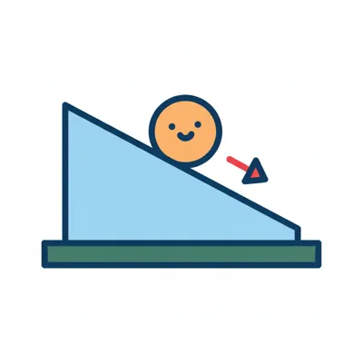 Ein lächelnder Ball rollt eine blaue schiefe Ebene hinunter, angezeigt durch einen Pfeil.
