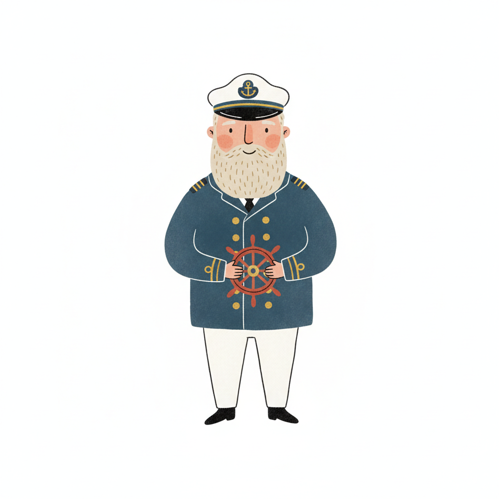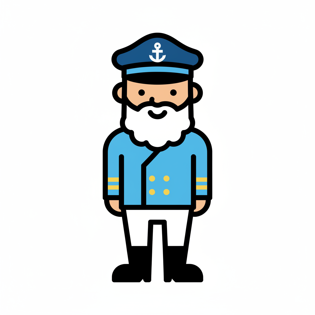 Ein cartoonhafter Kapitän mit Bart und Schiffsuniform.