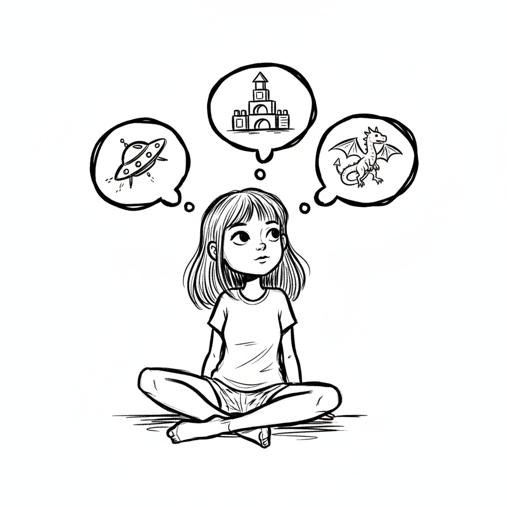 Ein Mädchen träumt von einem Drachen, einem Schloss und einem Raumschiff.