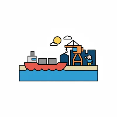 Ein Hafen mit einem Schiff, einem Kran und einer Person bei Sonnenlicht.
