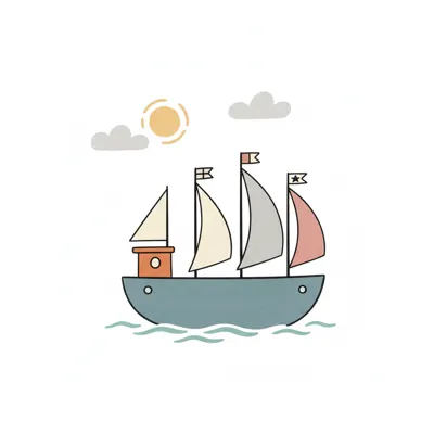 Ein stilisiertes Schiff mit bunten Segeln auf ruhigem Wasser unter Sonne.