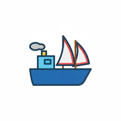 Ein einfaches, buntes Schiff mit Segeln und Smoke aus dem Schornstein.