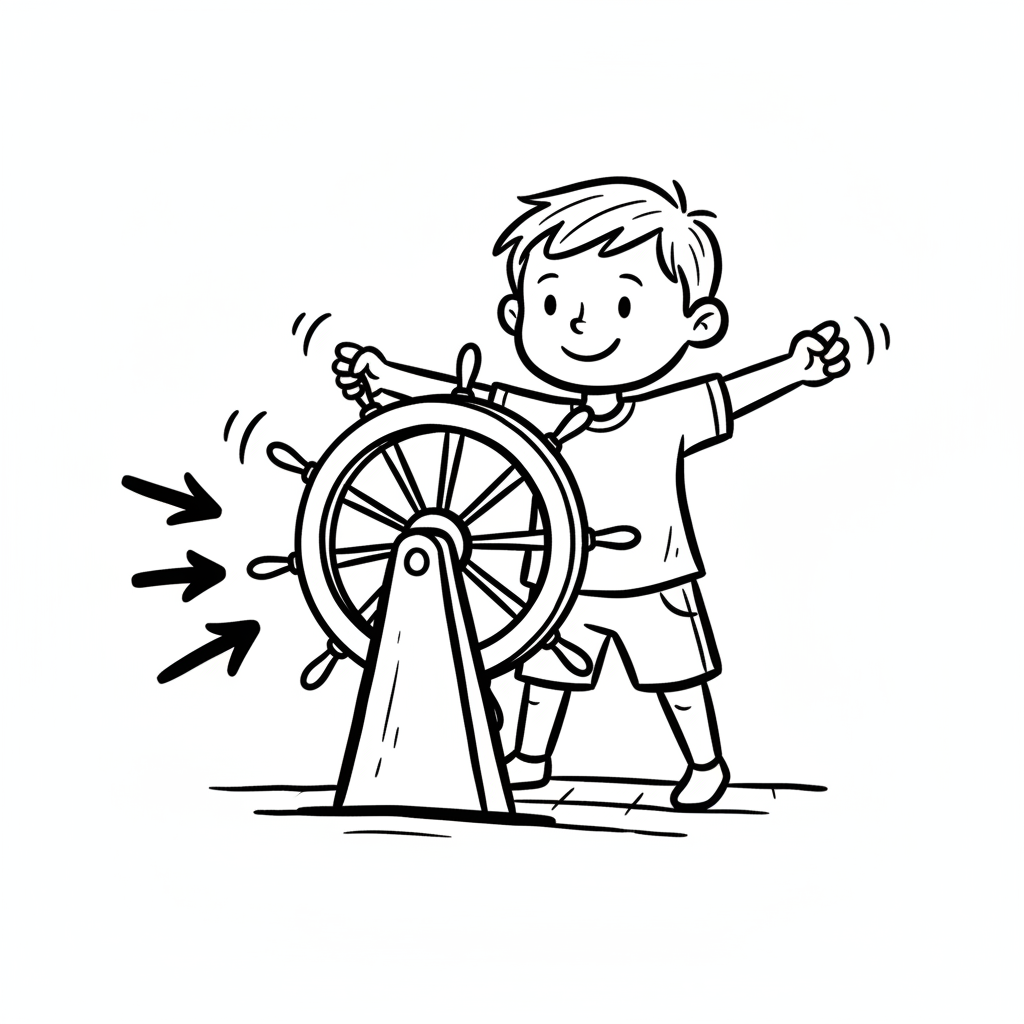 Ein lächelnder Cartoon-Junge steuert ein Schiffsrad, mit Pfeilen, die auf die Bewegung zeigen.