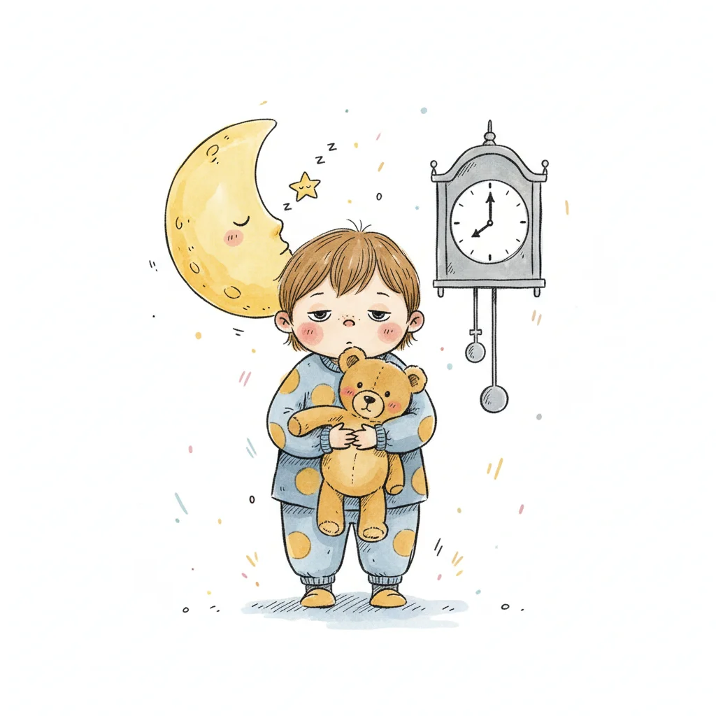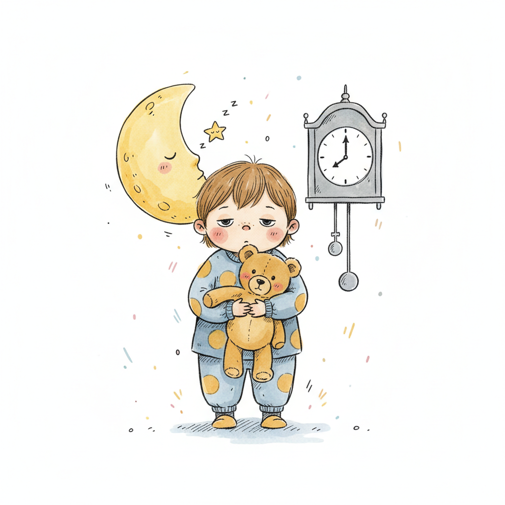 Müdes Kind im Schlafanzug mit Teddybär, schlafendem Mond und Uhr.